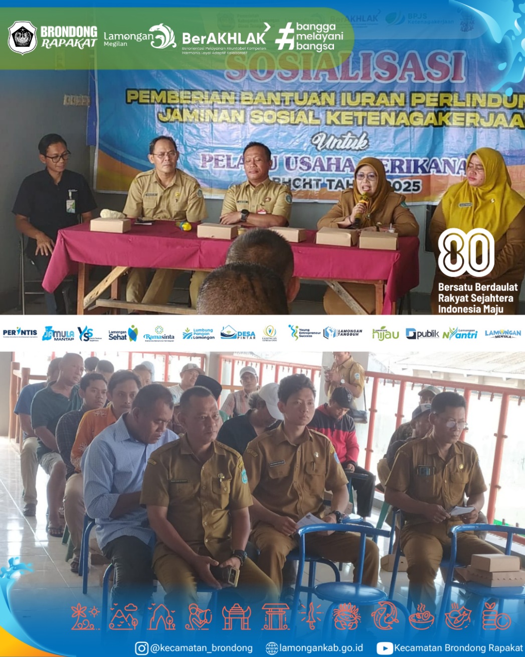 Selasa, 14 Oktober 2025, Pemerintah Kecamatan Brondong bersama Dinas Tenaga Kerja Kabupaten Lamongan melaksanakan kegiatan Sosialisasi Pemberian Bantuan Iuran Perlindungan Jaminan Sosial Ketenagakerjaan di UPT Perikanan Brondong. Kegiatan ini bertujuan memberikan pemahaman kepada pelaku usaha perikanan tentang pentingnya perlindungan jaminan sosial ketenagakerjaan. Melalui program bantuan iuran ini, diharapkan kesejahteraan dan keamanan kerja bagi pelaku usaha sektor perikanan dapat meningkat serta mendukung produktivitas ekonomi masyarakat pesisir.