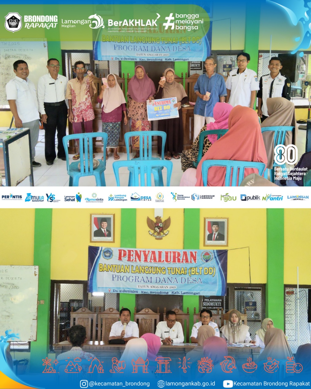 Rabu, 29 Oktober 2025, bertempat di Balai Desa Sidomukti, Kecamatan Brondong, dilaksanakan kegiatan penyaluran Bantuan Langsung Tunai (BLT) Dana Desa untuk bulan ke-7, 8, 9, dan 10 Tahun Anggaran 2025. Kegiatan ini dihadiri oleh perangkat desa dan perwakilan Kecamatan Brondong yang turut memantau jalannya penyaluran agar berjalan tertib dan tepat sasaran. Program ini merupakan wujud nyata perhatian pemerintah dalam mendukung kesejahteraan masyarakat dan membantu meringankan beban ekonomi warga kurang mampu di wilayah Desa Sidomukti.