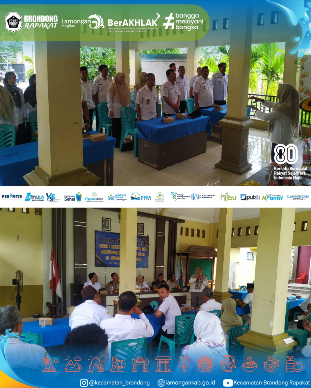 Rabu, 29 Oktober 2025, bertempat di Kantor Desa Tlogoretno, Kecamatan Brondong, dilaksanakan rapat koordinasi (rakor) yang diikuti oleh dinas, instansi, UPT Koordinator Wilayah, serta seluruh kepala desa dan lurah se-Kecamatan Brondong. Kegiatan ini bertujuan untuk memperkuat koordinasi antar lembaga serta membahas berbagai program strategis pemerintah dalam meningkatkan pelayanan dan pembangunan di wilayah Kecamatan Brondong. Melalui rakor ini diharapkan sinergitas antar perangkat pemerintahan semakin solid demi terwujudnya pelayanan publik yang optimal.