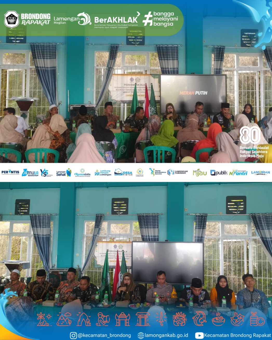 Kamis, 30 Oktober 2025, berlangsung kegiatan peringatan Maulid Nabi Muhammad SAW yang dirangkaikan dengan peresmian Dapur Makan Bergizi Gratis (MBG) di SPPG Yayasan Pondok Pesantren Mamba'ul Ulum Kecamatan Brondong. Acara ini dihadiri oleh jajaran pemerintah kecamatan, tokoh agama, pengurus yayasan, serta para santri. Kegiatan ini bertujuan untuk meneladani akhlak mulia Rasulullah SAW sekaligus meningkatkan kesejahteraan dan pemenuhan gizi santri melalui program MBG. Suasana penuh khidmat dan kebersamaan terlihat dalam kegiatan ini sebagai wujud sinergi antara lembaga pendidikan dan pemerintah dalam mendukung generasi yang sehat, berilmu, dan berakhlak mulia.