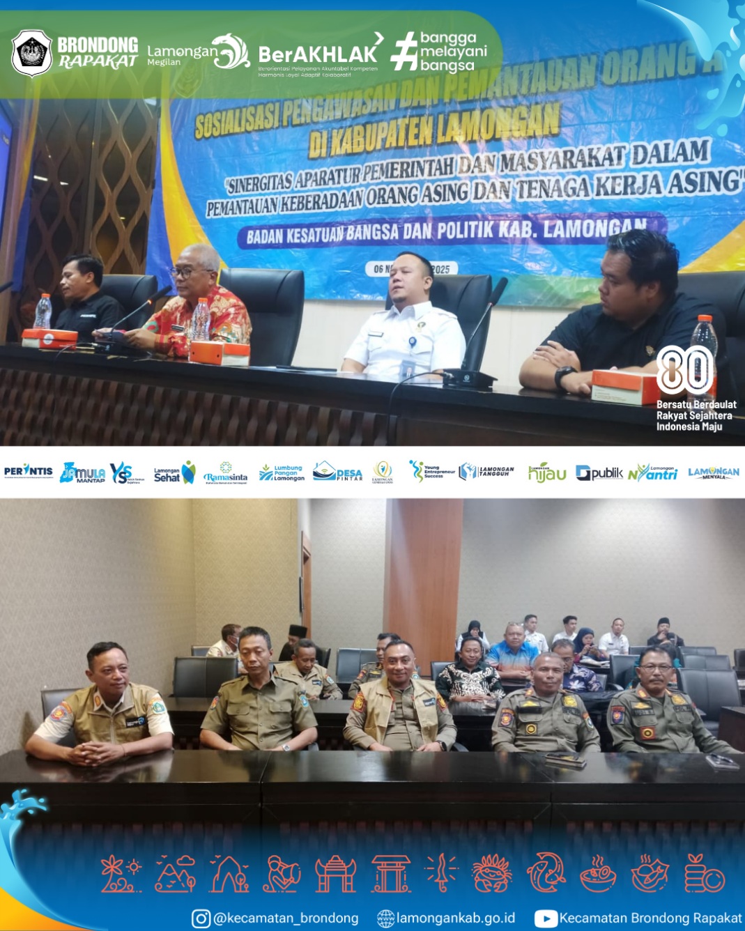 Kamis, 6 November 2025, bertempat di Ruang Pertemuan Badan Kesatuan Bangsa dan Politik (Bakesbangpol) Kabupaten Lamongan, dilaksanakan Rapat Sosialisasi Pengawasan Keberadaan Orang Asing dan Tenaga Kerja Asing. Kegiatan ini diikuti oleh perwakilan camat se-Kabupaten Lamongan, termasuk Kasi Trantibum Kecamatan Brondong, Sosialisasi tersebut bertujuan untuk memperkuat sinergi antara pemerintah daerah dan masyarakat dalam memantau serta mengawasi aktivitas orang asing dan tenaga kerja asing agar sesuai dengan ketentuan hukum yang berlaku di wilayah Kabupaten Lamongan.