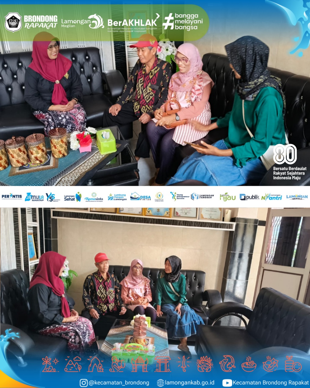 Kamis, 4 Desember 2025 di Ruang Camat Brondong, Ibu Camat Brondong menerima kunjungan pengurus Ling Tien Kung Sasana PWRI Kecamatan Brondong yang datang untuk menyampaikan rencana pelaksanaan ulang tahun ke-2 organisasi tersebut, sebagai bentuk koordinasi dan permohonan dukungan dari pemerintah kecamatan.