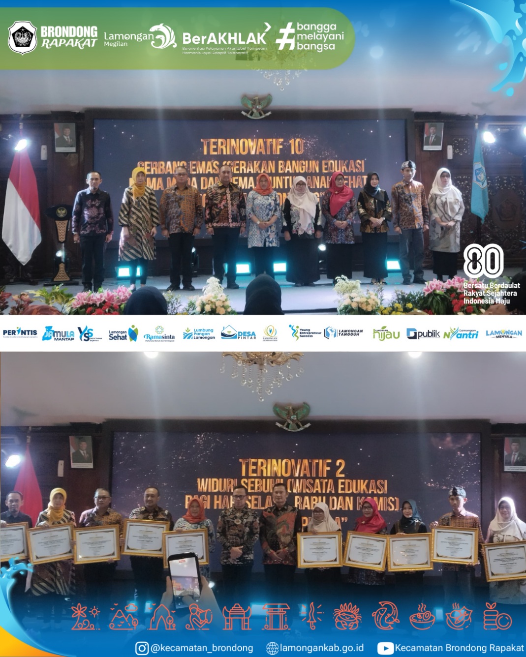 Jumat, 5 Desember 2025 di Pendopo Lokatantra Lamongan, berlangsung penerimaan Piagam Penghargaan Inovasi “Gerbang Emas” Megnotek yang diberikan kepada Kecamatan Brondong sebagai bentuk apresiasi atas inovasi pelayanan publik yang dinilai mampu meningkatkan efektivitas, transparansi, dan kemudahan layanan bagi masyarakat, di mana penghargaan tersebut diterima dengan penuh kebanggaan sebagai hasil kolaborasi dan kerja keras seluruh jajaran kecamatan dalam mengembangkan inovasi yang bermanfaat luas bagi warga.
