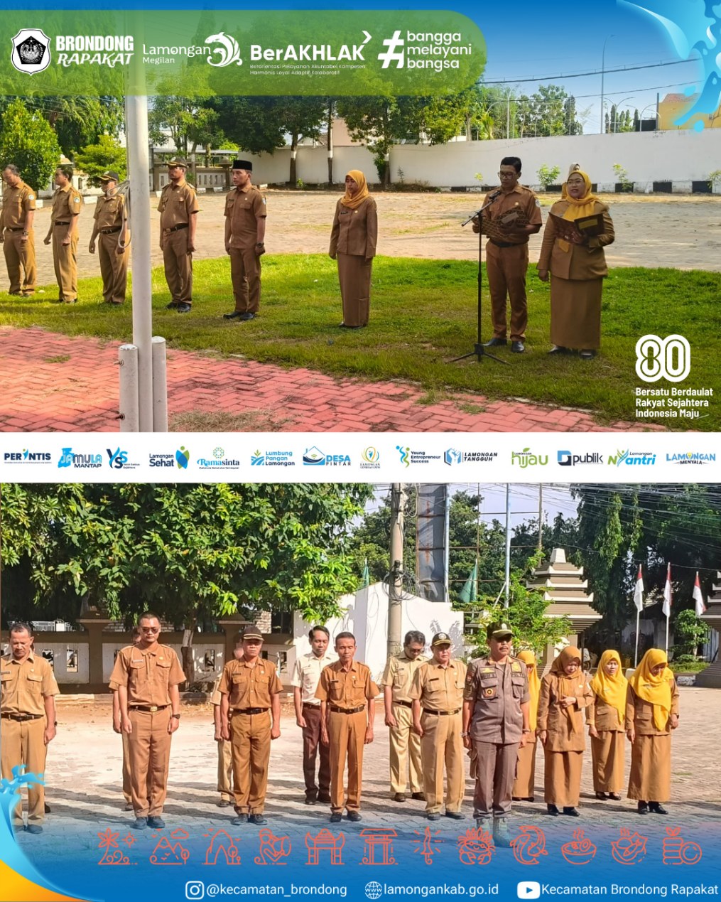 Senin, 8 Desember 2025 di Halaman Kecamatan Brondong, upacara Senin pagi berlangsung tertib dengan dihadiri seluruh staf kecamatan, di mana Ibu Camat menyampaikan amanat yang berisi evaluasi kinerja sebagai bentuk penguatan tugas pelayanan kepada masyarakat, sehingga kegiatan yang digelar secara rutin ini menjadi momentum penting untuk meneguhkan kedisiplinan, memperbaiki capaian kerja, dan memastikan seluruh perangkat kecamatan menjalankan tanggung jawabnya dengan lebih optimal melalui arahan yang jelas dan terstruktur.