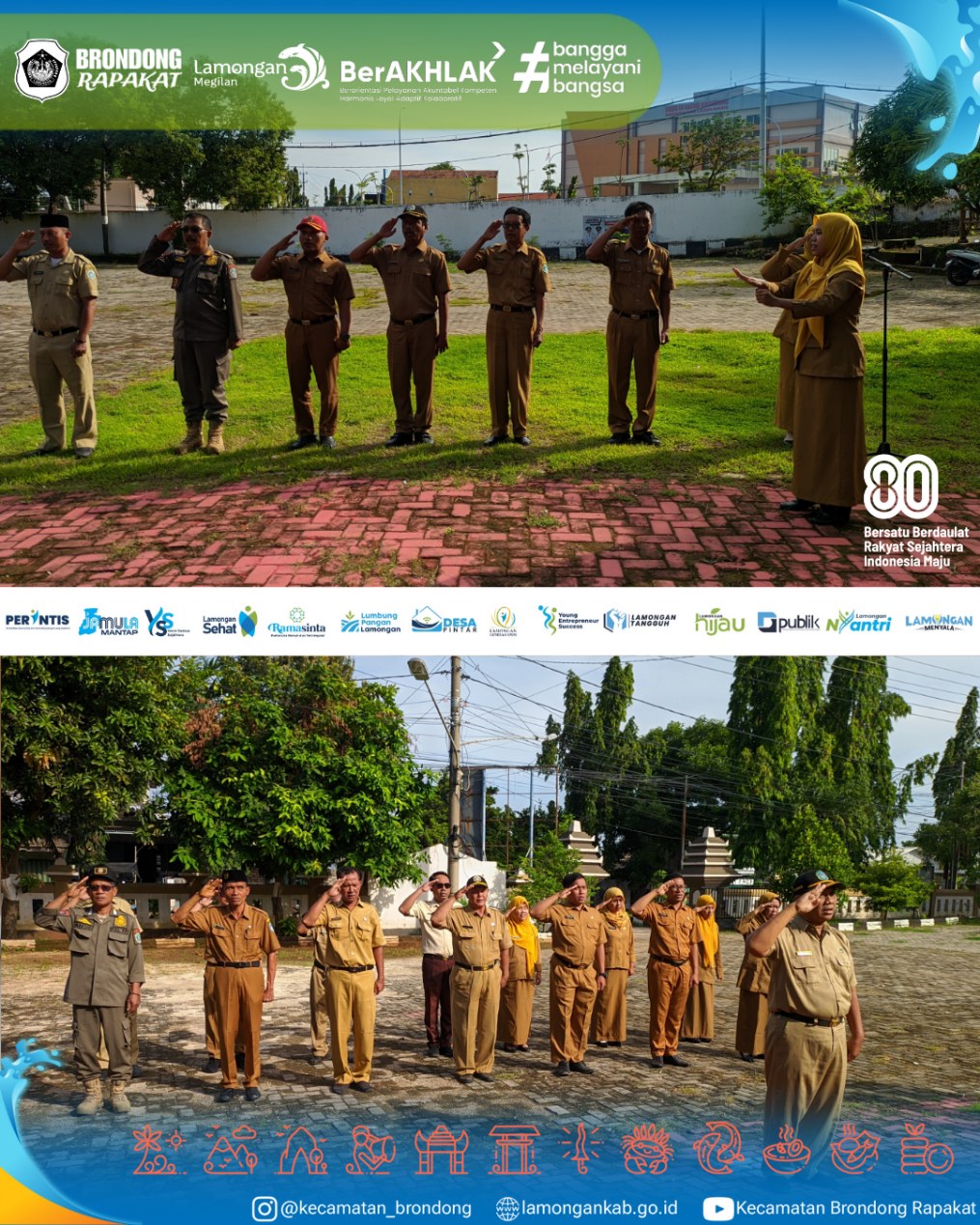 Senin, 29 Desember 2025, OPD Kecamatan Brondong melaksanakan apel Senin pagi di halaman kantor kecamatan yang diikuti oleh seluruh staf dan jajaran Kelurahan Brondong, di mana kegiatan ini dipimpin langsung oleh Ibu Camat sebagai bentuk penguatan kedisiplinan dan koordinasi kerja, dengan tujuan memastikan pelayanan publik berjalan optimal, tertib, dan profesional, serta dalam amanatnya beliau menyampaikan himbauan agar seluruh ASN meningkatkan tanggung jawab, menjaga integritas, dan memberikan pelayanan terbaik kepada masyarakat melalui kerja yang cepat, ramah, dan berorientasi pada kepuasan warga.