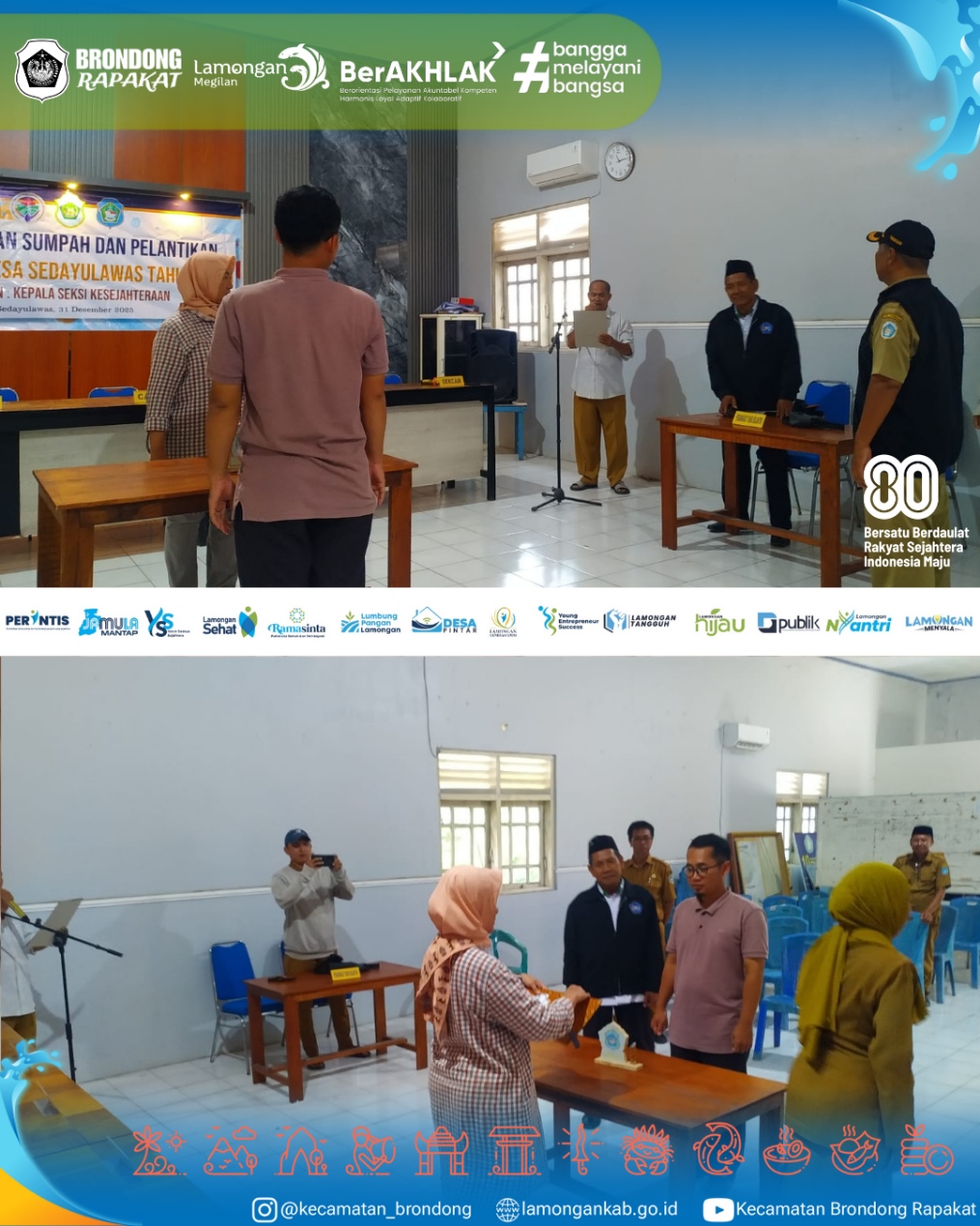 Selasa, 30 Desember 2025, Kasi Pemerintahan bersama staf Kecamatan Brondong dan perangkat Desa Sedayulawas melaksanakan gladi persiapan pengambilan sumpah dan pelantikan Perangkat Desa Sedayulawas untuk Jabatan Kasi Kesejahteraan di Balai Desa Sedayulawas, di mana kegiatan ini dilakukan untuk memastikan seluruh rangkaian acara berjalan lancar dan khidmat, dengan mengoordinasikan tata acara, posisi petugas, serta alur pelantikan sehingga pelaksanaan resmi nantinya dapat berlangsung tertib, rapi, dan sesuai ketentuan yang berlaku.