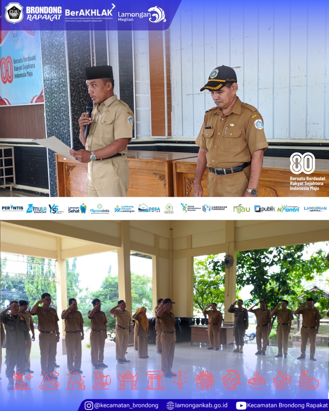 5 Januari 2025, di Aula Pendopo Kecamatan Brondong, telah dilaksanakan apel Senin pagi yang diikuti oleh staf Kecamatan Brondong dan staf Kelurahan Brondong, dengan apel dipimpin oleh Sekretaris Kecamatan Brondong sebagai agenda rutin untuk mengawali pelaksanaan tugas aparatur pemerintahan.