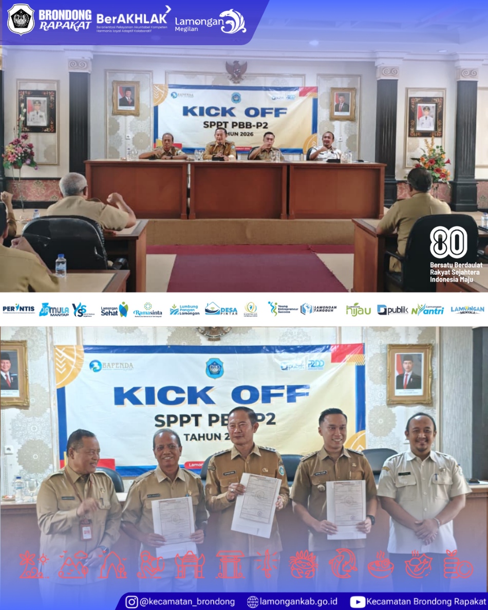 5 Januari 2025, di Ruang Sasana Nayaka Lantai 2 Kabupaten Lamongan, telah dilaksanakan kegiatan Kick Off Cetak SPPT PBB-P2 Tahun 2026 yang dihadiri oleh Camat Brondong Nurul Khumaidah, S.H., M.M., para camat se-Kabupaten Lamongan, serta Kepala Bagian instansi terkait di lingkungan Pemerintah Kabupaten Lamongan sebagai penanda dimulainya tahapan penting pengelolaan Pajak Bumi dan Bangunan Perdesaan dan Perkotaan.