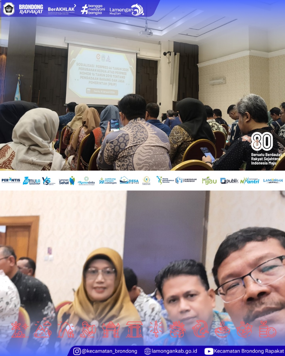 Kamis, 15 Januari 2025, bertempat di Ruang Rapat “Gajah Mada” Lantai 7 Sekretariat Daerah Kabupaten Lamongan, dilaksanakan kegiatan sosialisasi Peraturan Presiden Nomor 46 Tahun 2025 tentang Perubahan Kedua atas Peraturan Presiden Nomor 16 Tahun 2018 mengenai Pengadaan Barang/Jasa Pemerintah. Kegiatan ini diikuti oleh Ibu Camat Brondong bersama Kasubbag Keuangan, sebagai bentuk partisipasi aktif jajaran kecamatan dalam memahami kebijakan terbaru di bidang pengadaan.
