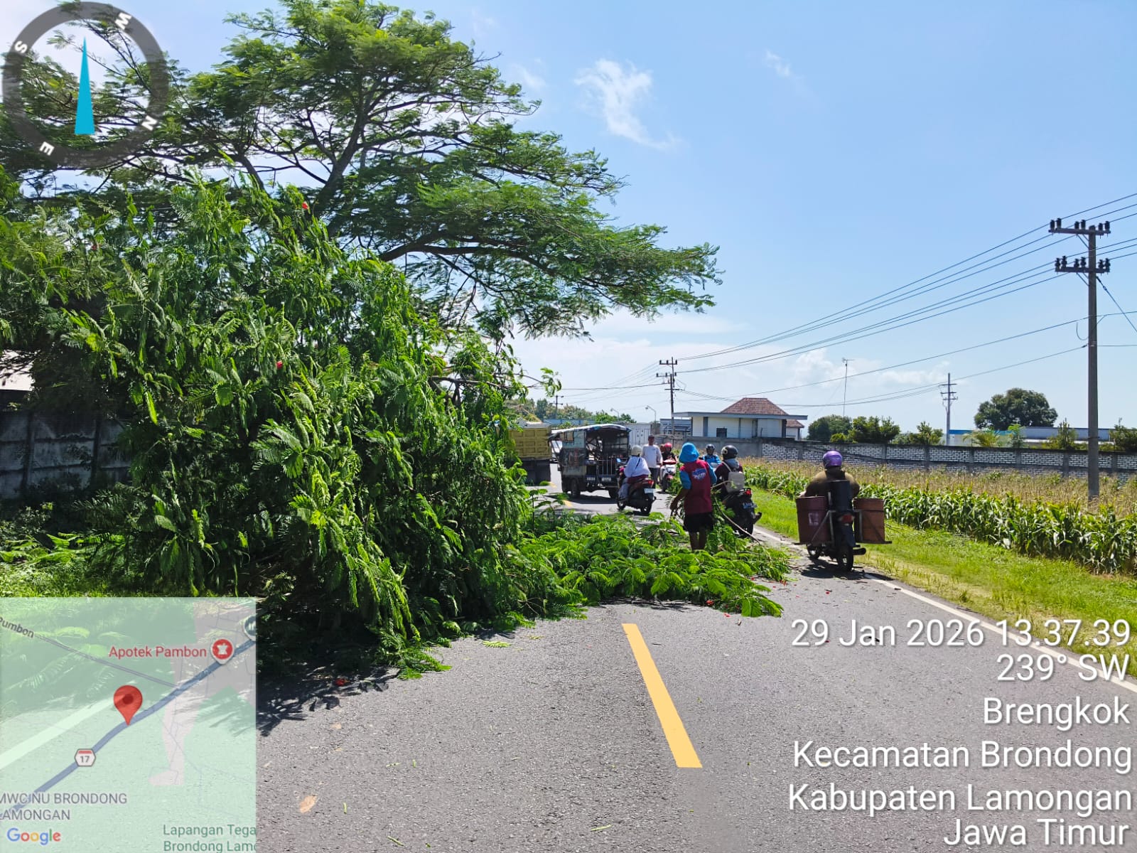 Kamis, 29 Januari 2026, bertempat di wilayah Pantura Kecamatan Brondong, khususnya di Desa Brengkok, Kabupaten Lamongan, telah dilaksanakan kegiatan perapian pohon yang berpotensi membahayakan keselamatan pengguna jalan dan lingkungan sekitar. Kegiatan ini dilaksanakan oleh Kasi Ketenteraman dan Ketertiban Umum (Trantibum) Kecamatan Brondong sebagai langkah antisipatif menghadapi kondisi cuaca ekstrem.