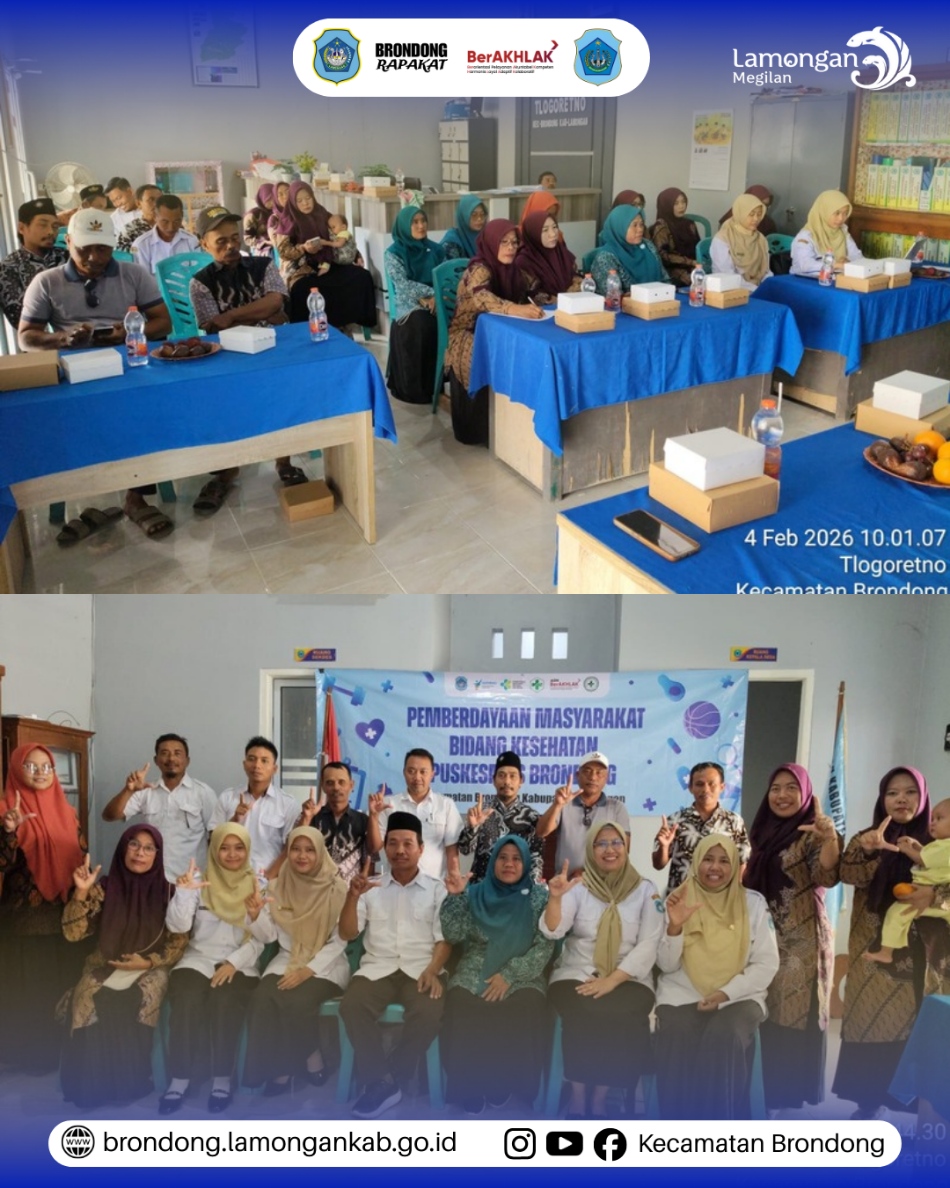 Senin, 2 Februari 2026, di Balai Desa Tlogoretno, Puskesmas Brondong melaksanakan kegiatan pemberdayaan masyarakat bidang kesehatan bersama Kepala Desa Tlogoretno dan perangkat desa, perwakilan Puskesmas, TP PKK, serta tamu undangan sebagai upaya meningkatkan pengetahuan dan peran aktif masyarakat dalam menjaga kesehatan keluarga dan lingkungan, di mana kegiatan ini dilakukan melalui penyampaian materi, diskusi, dan pendampingan langsung kepada peserta sehingga terbangun kesadaran bersama untuk menerapkan perilaku hidup bersih dan sehat demi terwujudnya masyarakat Desa Tlogoretno yang sehat, mandiri, dan berdaya.