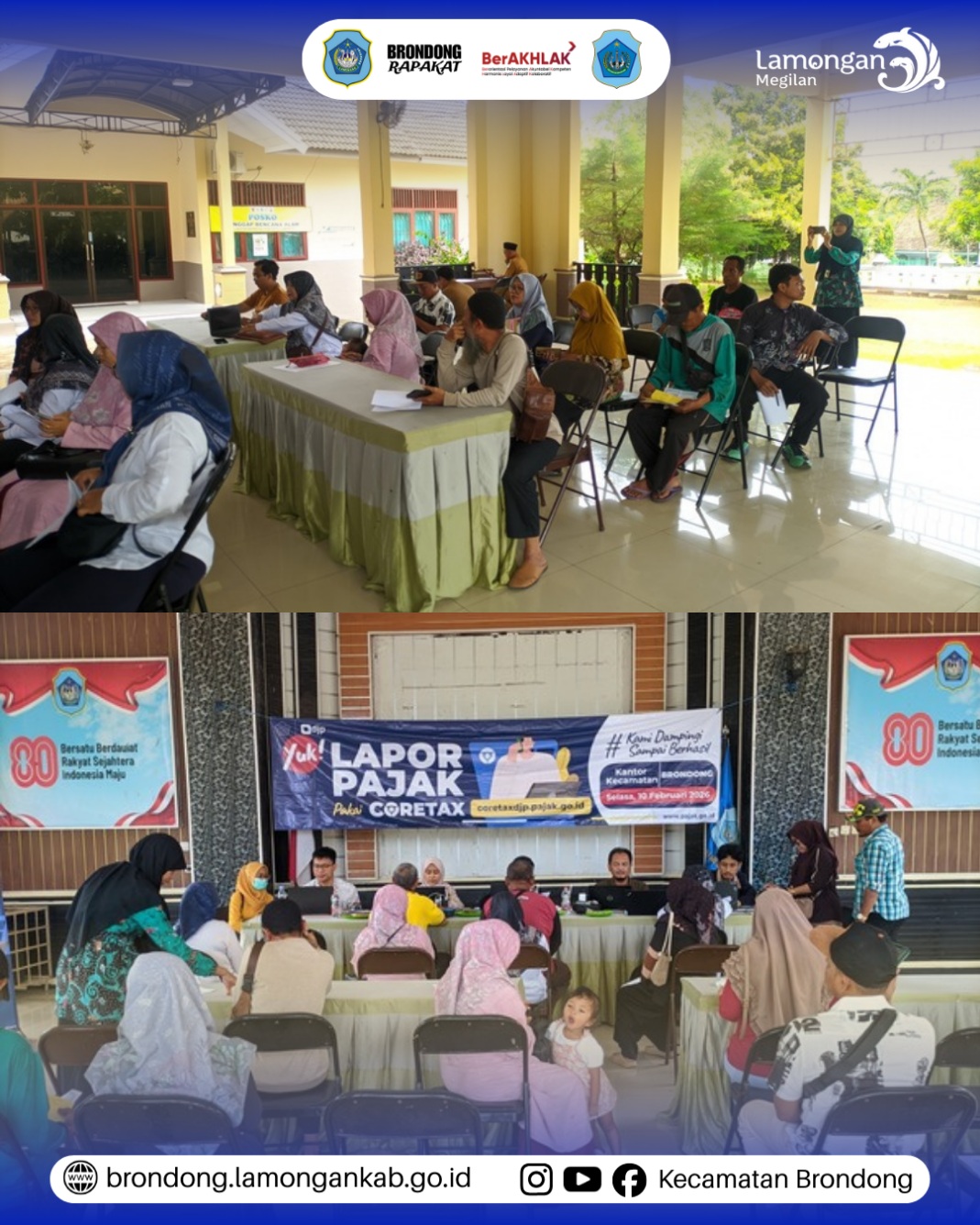 Selasa, 10 Februari 2026, di Pendopo Kecamatan Brondong, KPP Pratama Lamongan bersama Pemerintah Kecamatan Brondong melaksanakan pelayanan pelaporan SPT Tahunan kepada masyarakat dengan menggunakan aplikasi Coretax sebagai upaya memudahkan wajib pajak dalam memenuhi kewajiban perpajakan secara tepat waktu, tertib, dan aman, di mana layanan ini dilakukan melalui pendampingan langsung oleh petugas kepada masyarakat mulai dari proses login, pengisian data, hingga pengiriman laporan, sehingga pelaksanaan layanan berjalan lancar dan mendapat antusiasme tinggi dari warga Kecamatan Brondong.