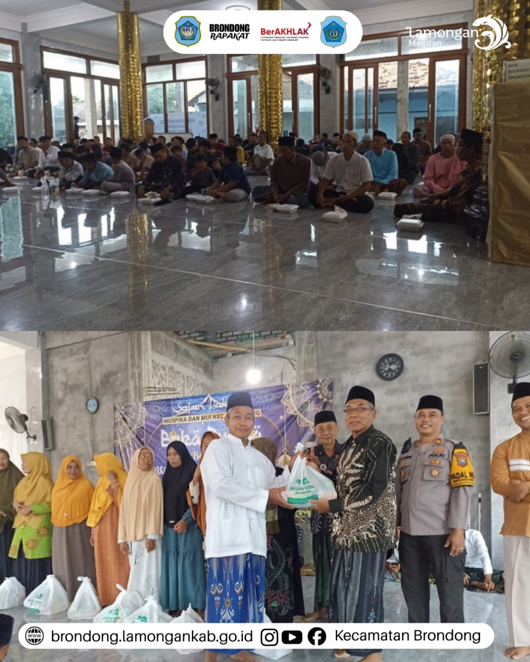 Sabtu, 14 Maret 2026, di Masjid Al Azhar Cumpleng Desa Brengkok, Kecamatan Brondong, Forkopimcam dan MUI Brondong melaksanakan kegiatan Safari Ramadhan yang dihadiri oleh unsur Forkopimcam, MUI, serta masyarakat setempat, dengan pihak Kecamatan Brondong diwakili oleh Sekretaris Camat (Sekcam). Kegiatan ini diselenggarakan sebagai sarana mempererat silaturahmi antara pemerintah, tokoh agama, dan masyarakat sekaligus meningkatkan semangat ibadah di bulan suci Ramadan. Dalam pelaksanaannya, acara diawali dengan sambutan dari unsur Forkopimcam yang menyampaikan pesan kebersamaan dan pentingnya menjaga kerukunan di lingkungan masyarakat. Selanjutnya, dilakukan penyerahan bantuan berupa dispenser untuk Masjid Al Azhar serta pembagian bantuan sosial kepada masyarakat yang membutuhkan, kemudian dilanjutkan dengan tausiyah keagamaan yang memberikan motivasi spiritual kepada para jamaah agar semakin meningkatkan ibadah dan kepedulian sosial selama bulan Ramadan.